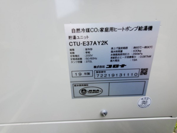 埼玉県坂戸市自然冷媒CO2家庭用ヒートポンプ給湯機貯湯ユニットCTU-E37AY2K、ヒートポンプユニットCHP-Y452K